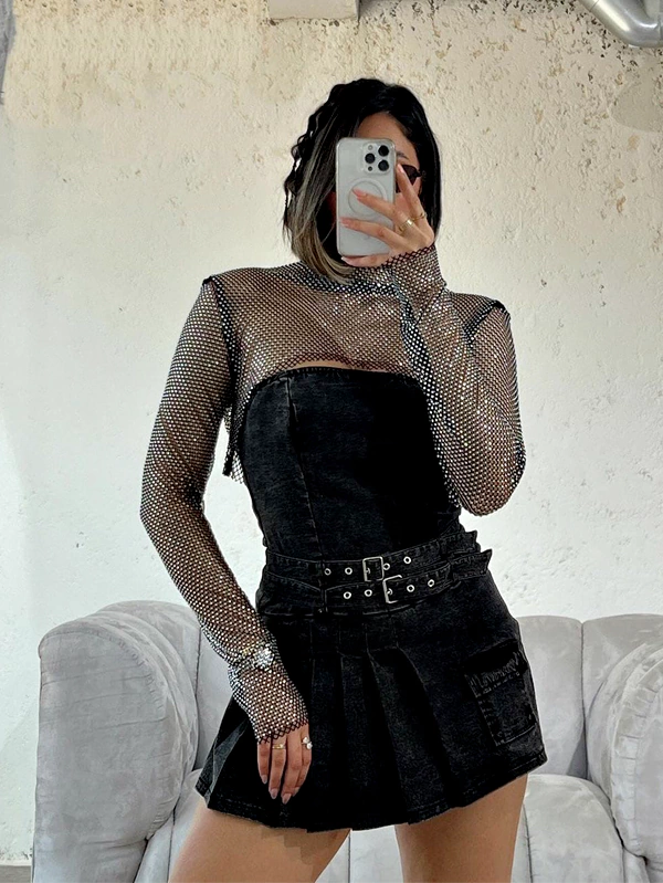 Cropped em tela de strass, perfeito para completar looks com muito brilho e estilo.